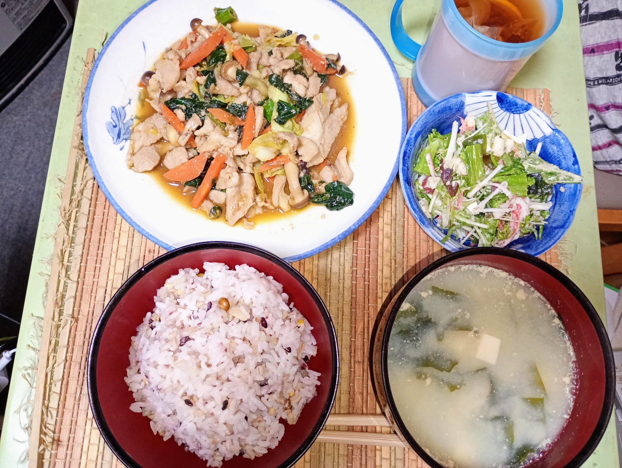 - 夕食:豚肉と野菜の塩こうじショウガ炒め 焼肉のたれに塩こうじとショウガをプラス。発酵食品と身体を温める食材を組み合わせ、明日からの仕事に向けたエネルギーを充填しました。