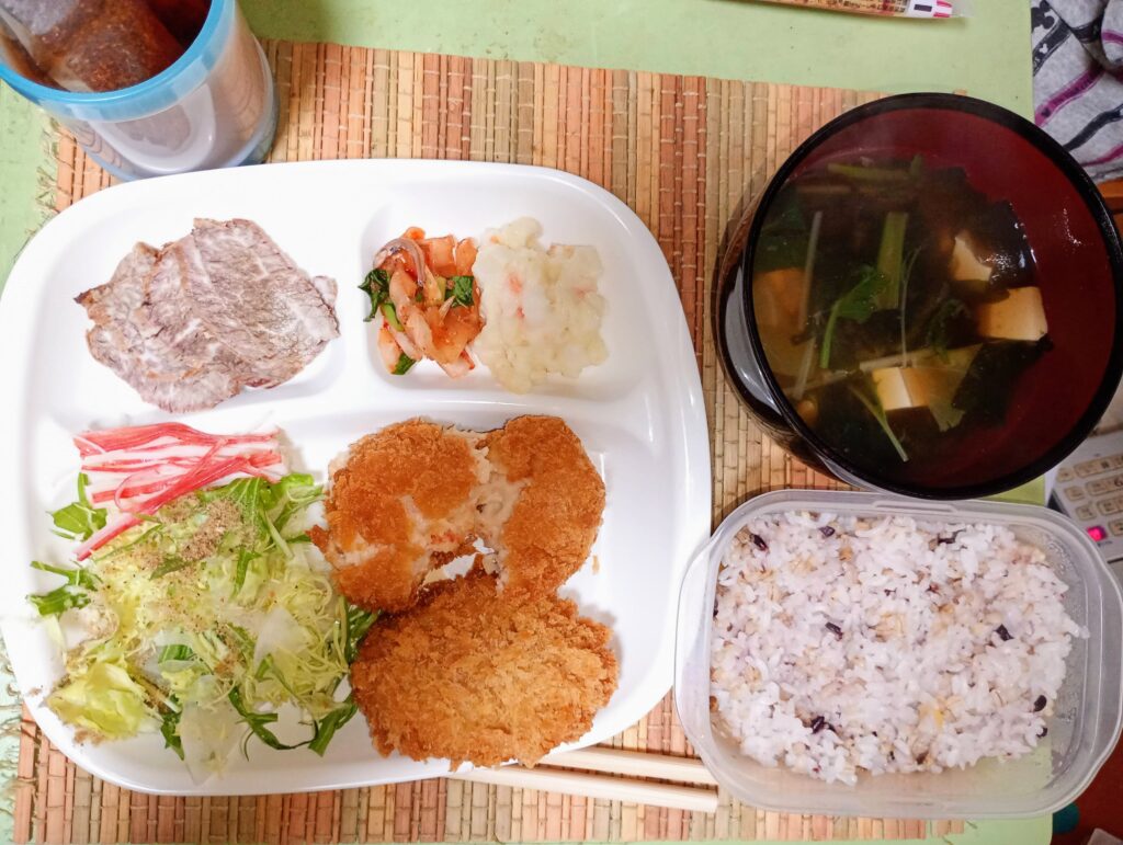 ■ 週末の「フライデー」飯 夕食は金曜恒例の揚げ物、通称「フライデー」。 いつものお肉屋さんで手に入れた和牛のたたき(訳ありセール品!)や揚げ物を楽しみつつ、副菜や汁物で「まごわやさしい」をしっかりカバー。